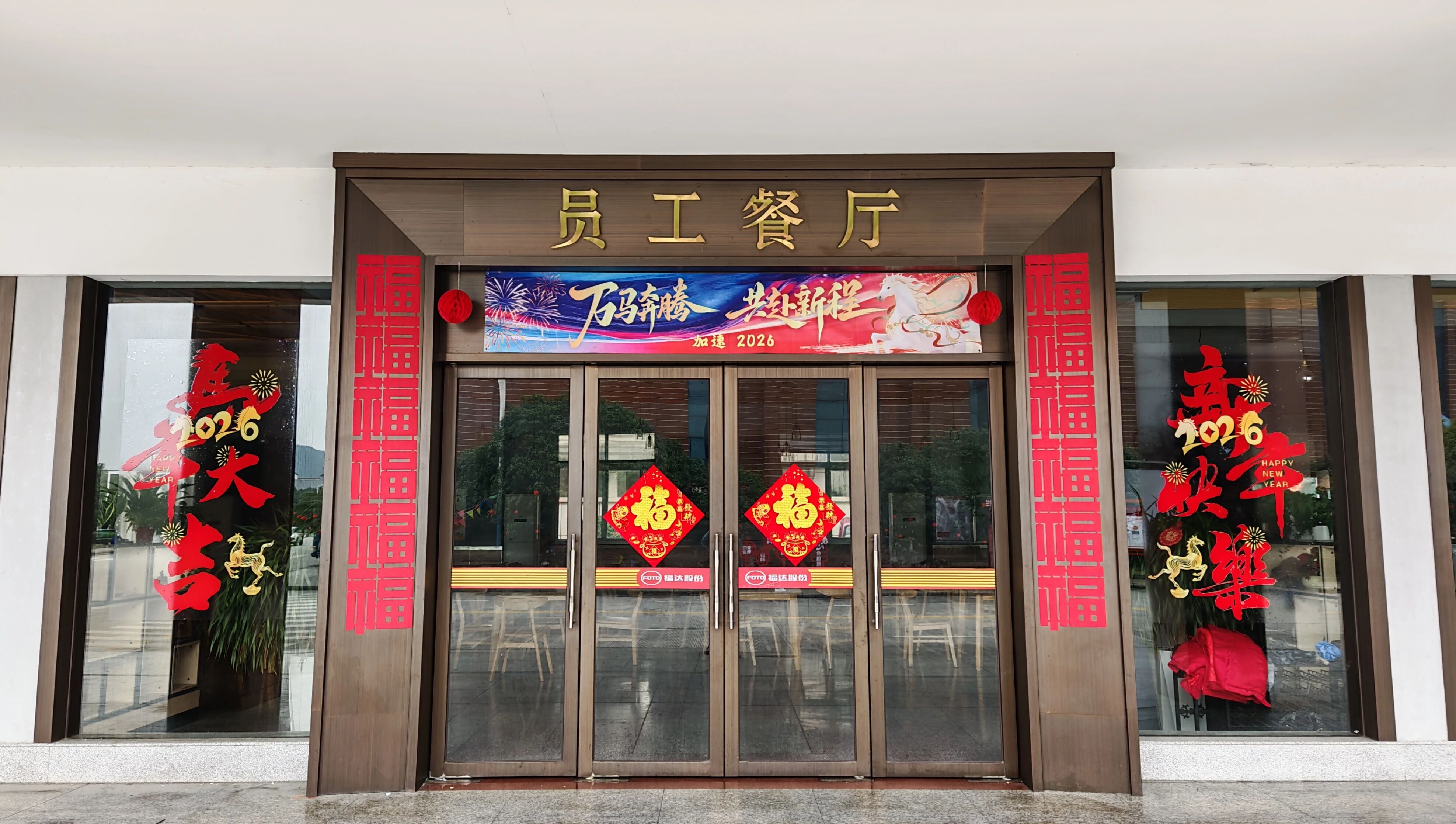 在公司大門口,懸掛四盞大紅燈籠,擺放果實累累的年橘;在辦公樓和員工餐廳前,張貼福字和馬年創意貼紙,還擺放金黃飽滿的年橘;在辦公樓內,擺放馬年主題創意裝飾盒,懸掛馬年祝福條幅和精美的中國結;在主干道兩旁的樹木上,掛了成串的小燈籠。從大門到車間,從室外到室內,每一處都傳遞了對新年的祝福,都凝聚著福達人對未來的憧憬與熱愛。